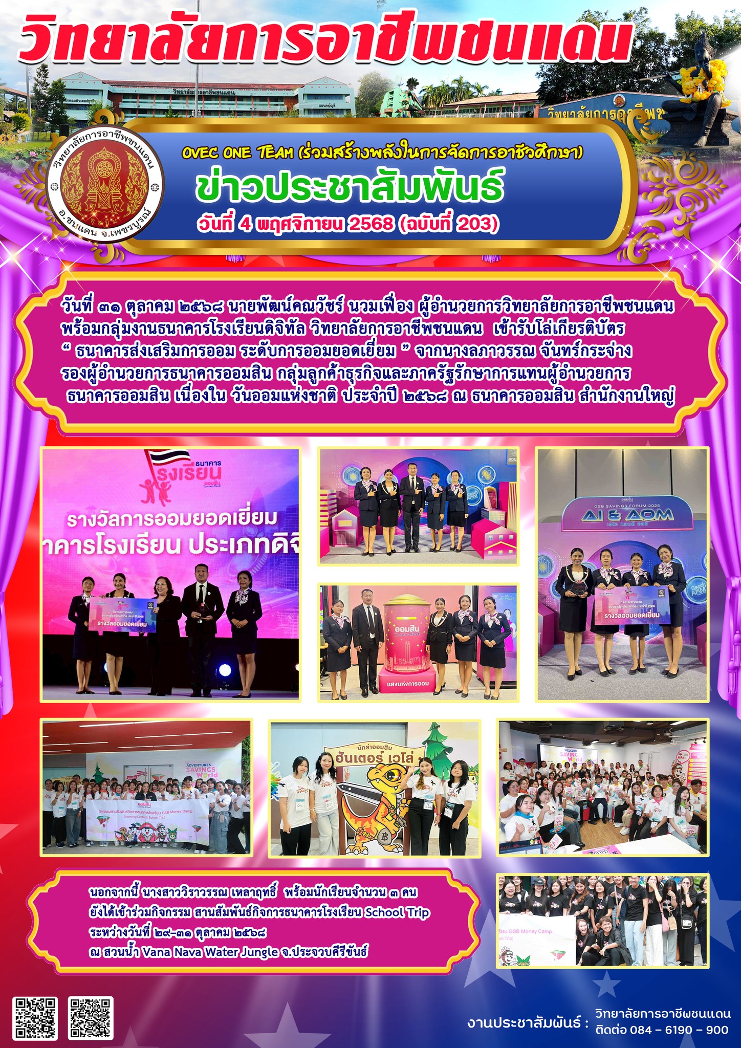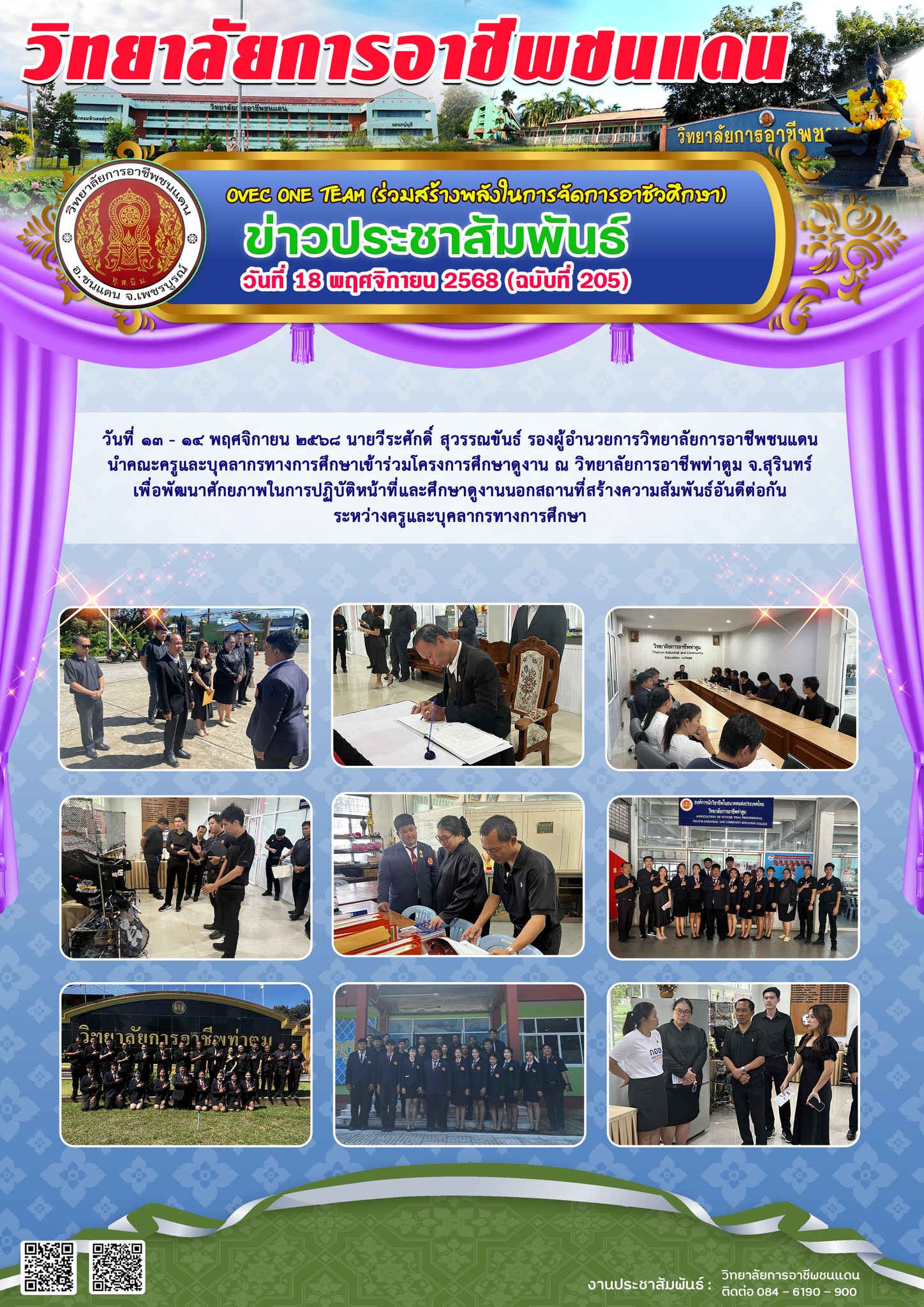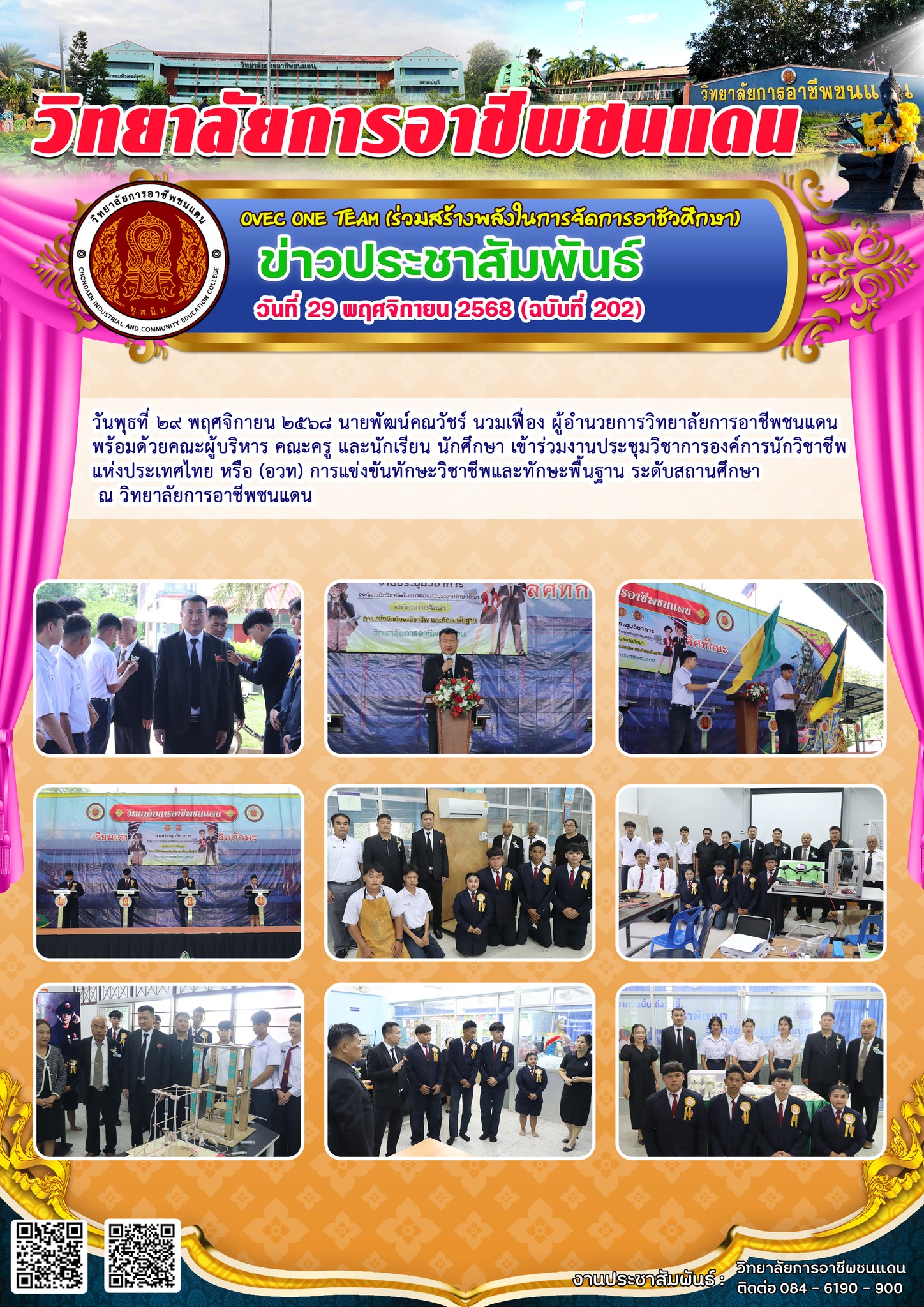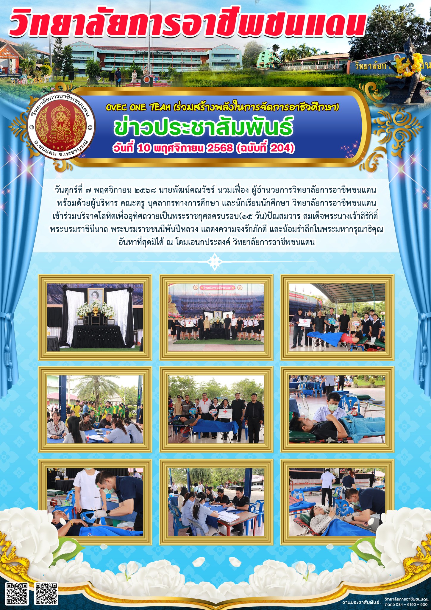 วันศุกร์ที่ 7 พฤศจิกายน 2568 เวลา 08:30 นายพัฒน์คณวัชร์ นวมเฟื่อง ผู้อำนวยการวิทยาลัยการอาชีพชนแดน พร้อมด้วยผู้บริหาร คณะครู บุคลากรทางการศึกษา และนักเรียน นักศึกษา วิทยาลัยการอาชีพชนแดน เข้าร่วมบริจาคโลหิต เพื่ออุทิศถวายเป็นพระราชกุศลครบรอบ (15วัน) ปัณสมวาร สมเด็จพระนางเจ้าสิริกิติ์ พระบรมราชินีนาถ พระบรมราชชนนีพันปีหลวง แสดงความจงรักภักดี และน้อมรำลึกในพระมหากรุณาธิคุณอันหาที่สุดมิได้ ณ โดมเอนกประสงค์ วิทยาลัยการอาชีพชนแดน