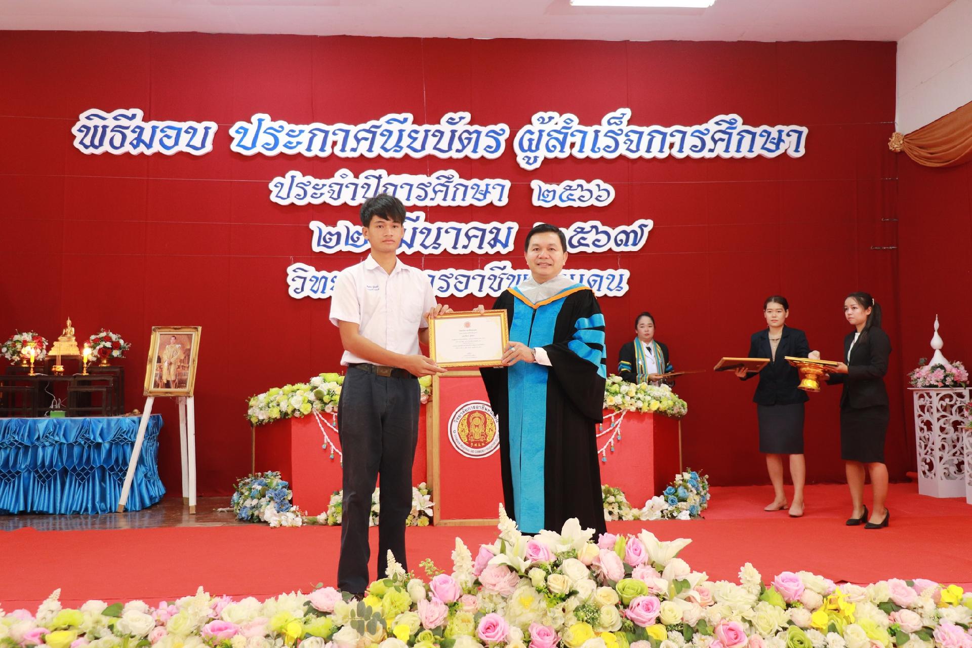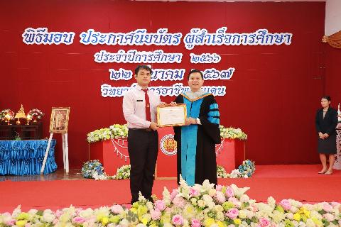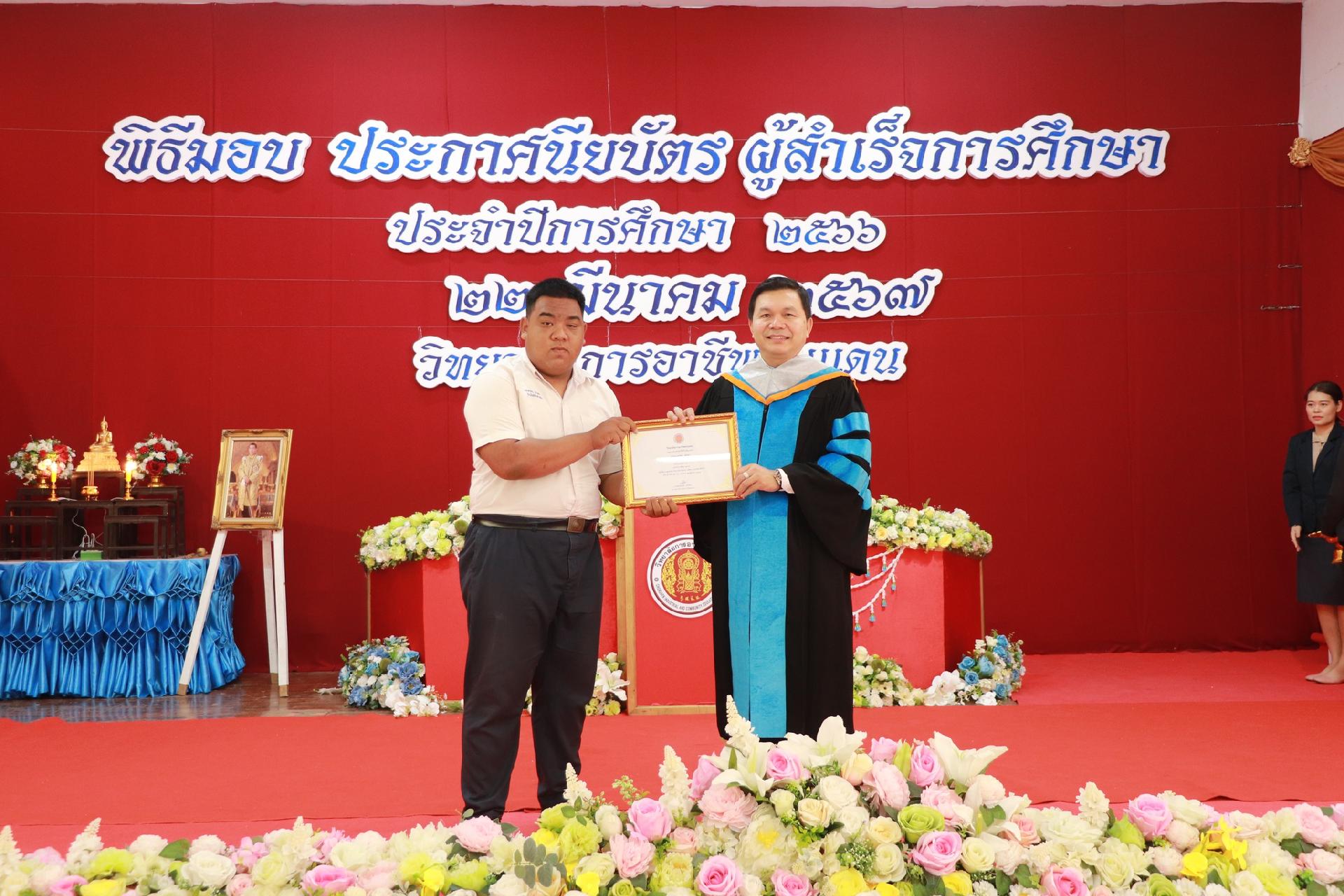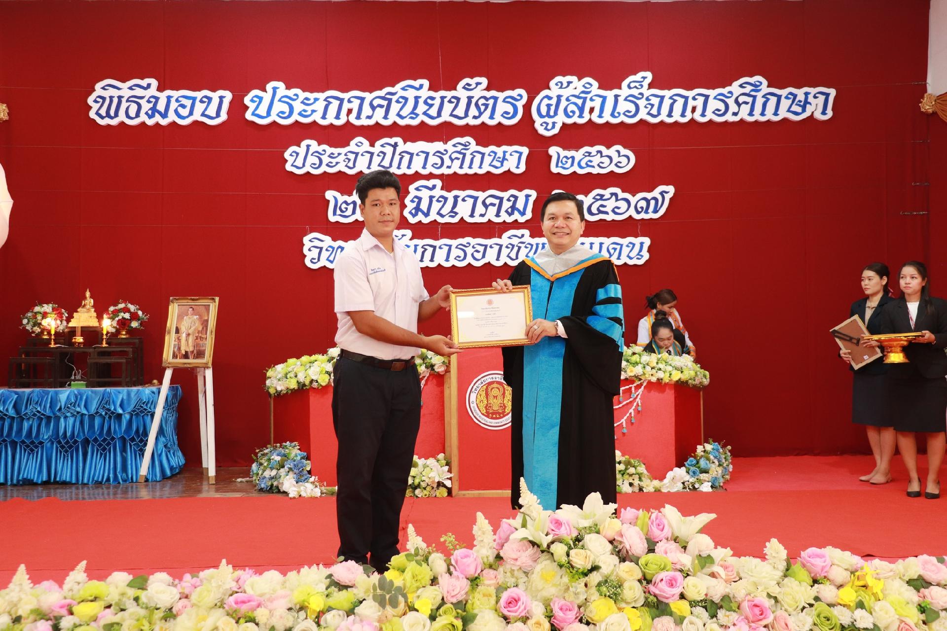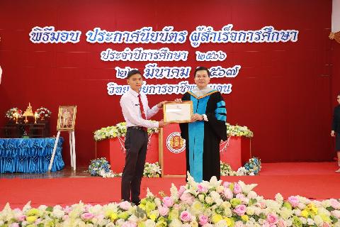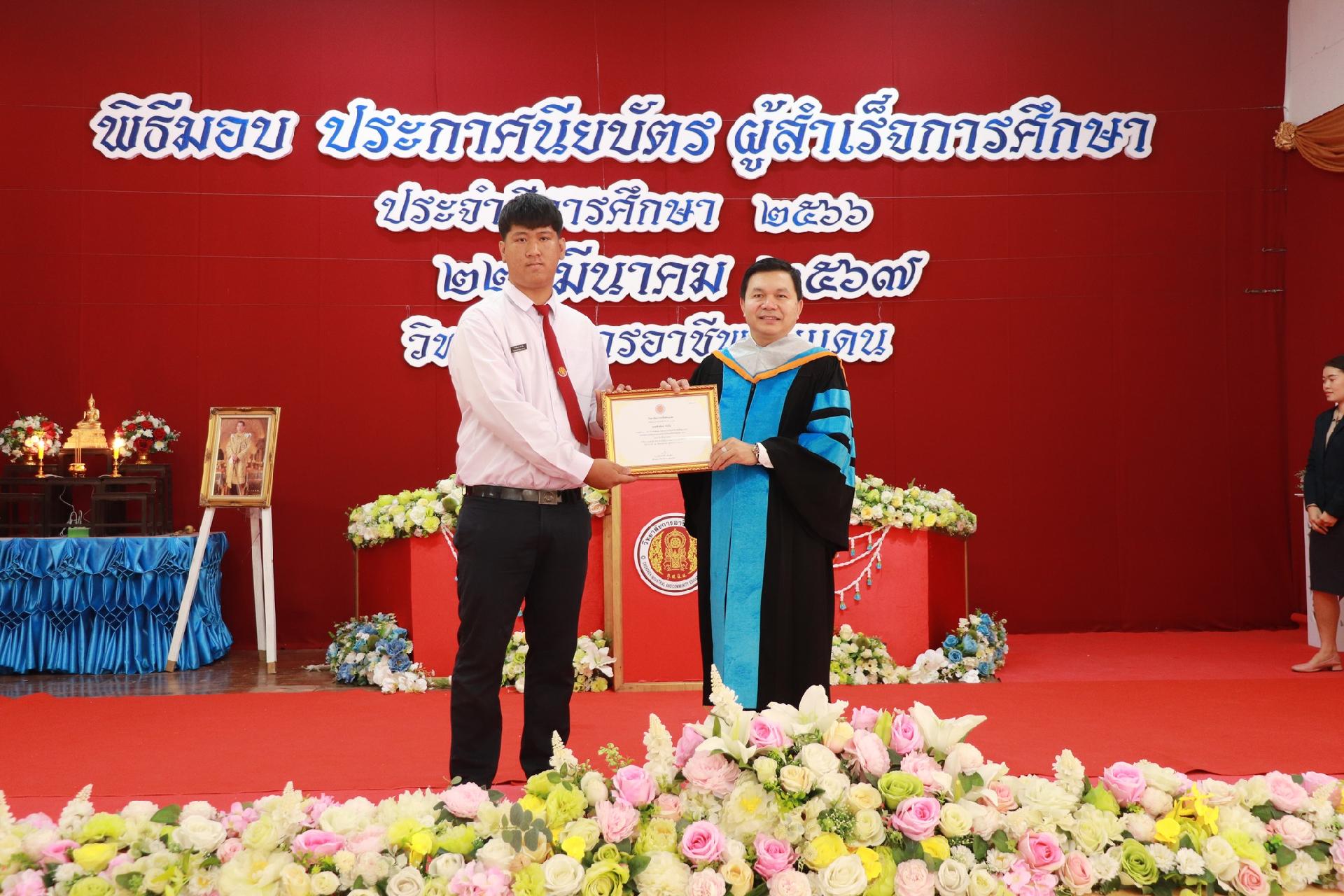 | รายละเอียดกิจกรรม | พิธีมอบเกียรติบัตร ผู้สำเร็จการศึกษา ประจำปีการศึกษา 2566 ให้กับนักเรียน นักศึกษา วิทยาลัยการอาชีพชนแดน โดย ดร.นิรุตต์ บุตรแสนลี ผู้อำนวยการสำนักวิจัยและพัฒนาการอาชีวศึกษา ให้เกียรติมาเป็นประธาน |