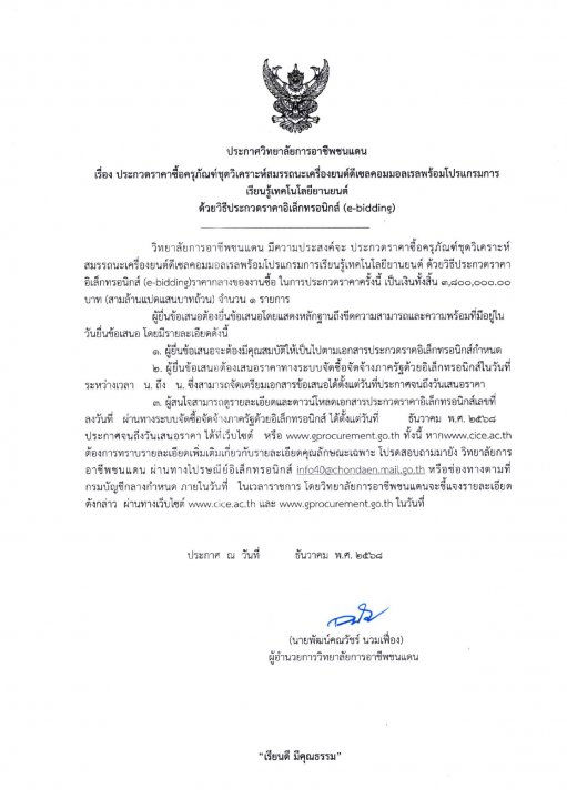 | หัวข้อข่าว | ประกาศวิทยาลัยการอาชีพชนแดน เรื่อง ประกวดราคาซื้อครุภัณฑ์ชุดวิเคราะห์สมรรถนะเครื่องยนต์ดีเซลคอมมอลเรล พร้อมโปรแกรมการเรียนรู้เทคโนโลยียานยนต์ ด้วยวิธีประกวดราคาอิเล็กทรอนิกส์ (e-bidding) |