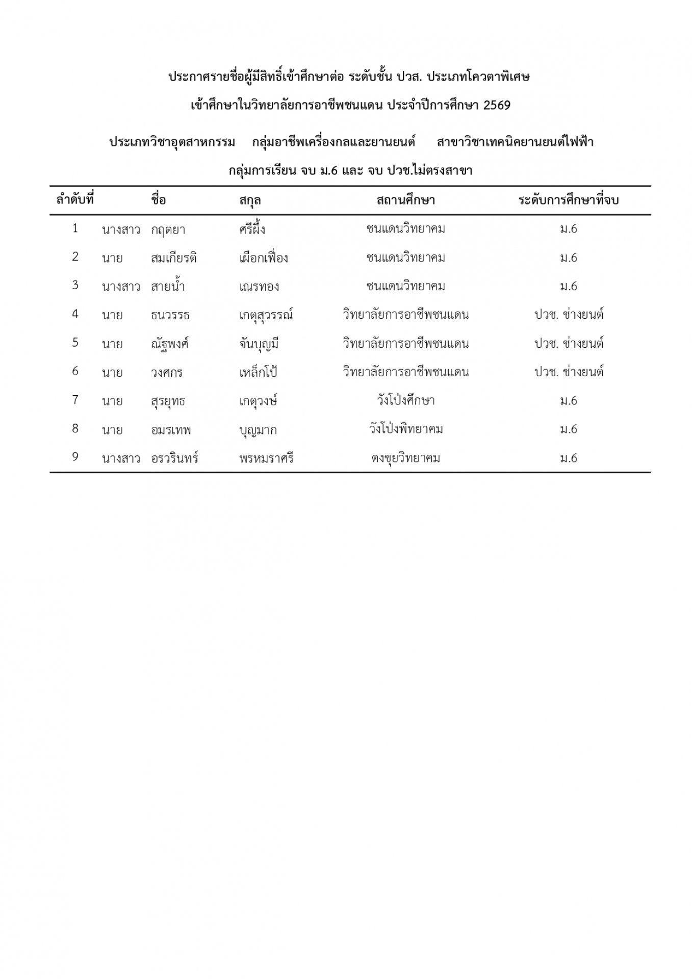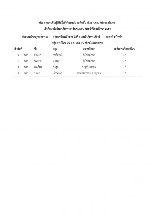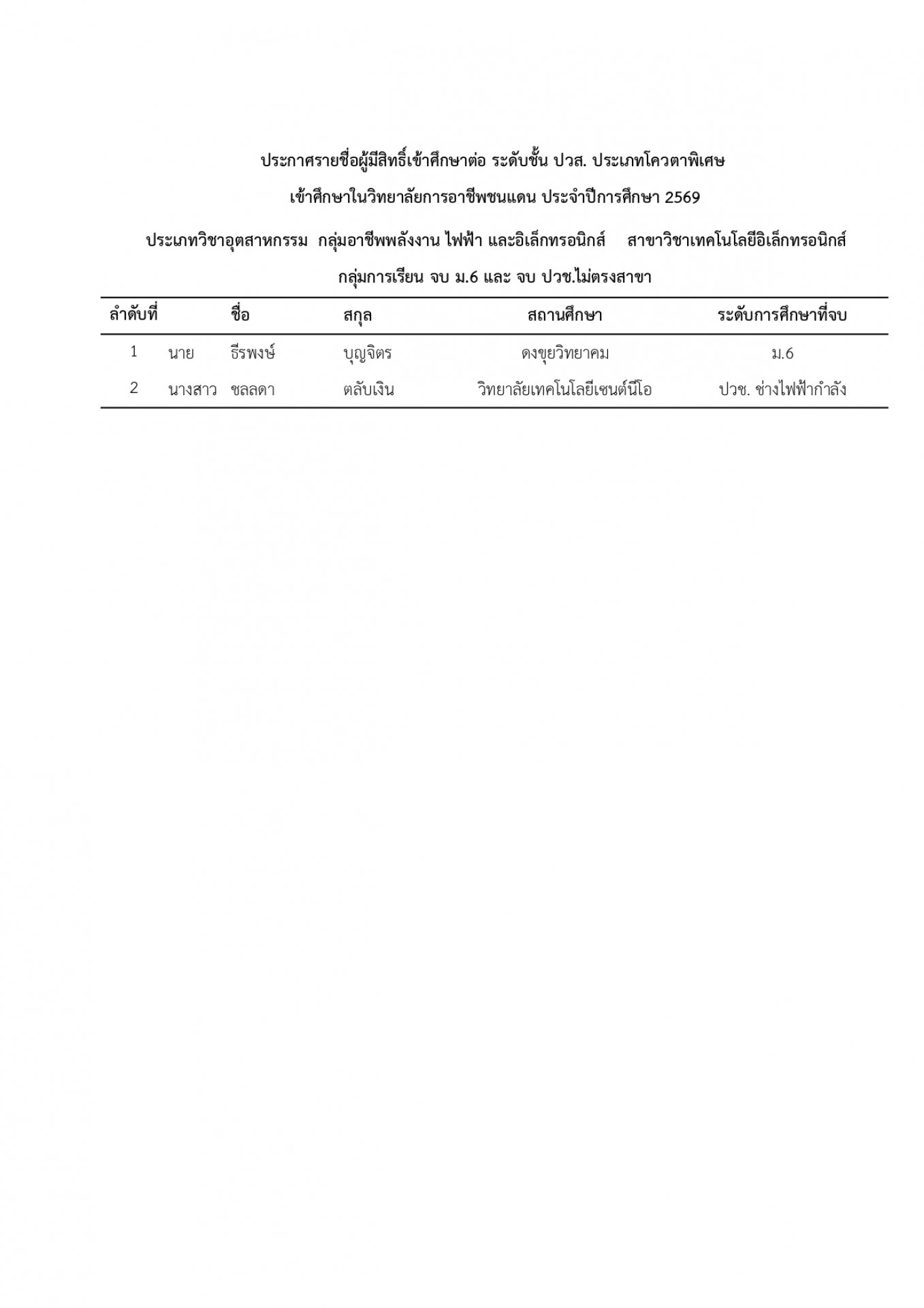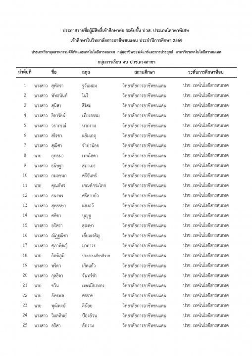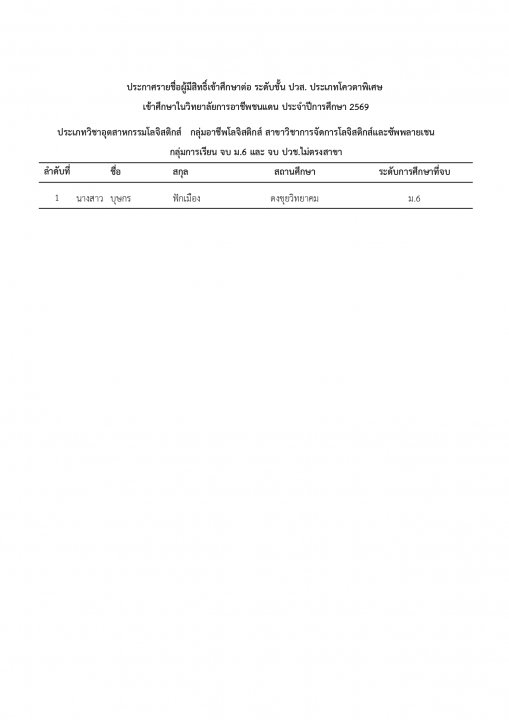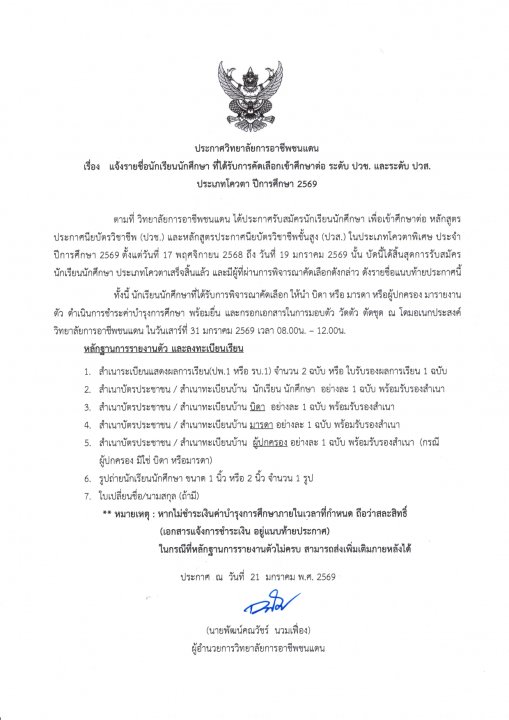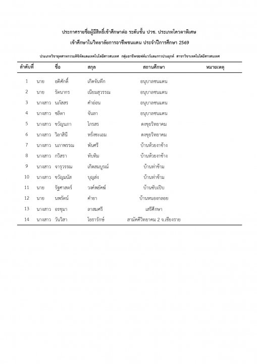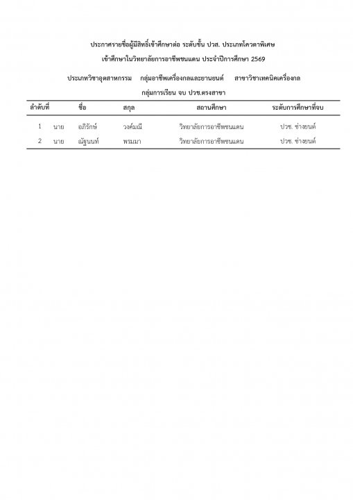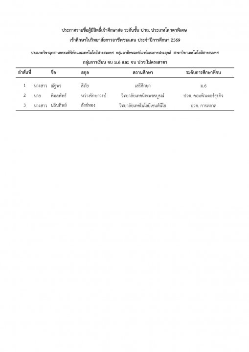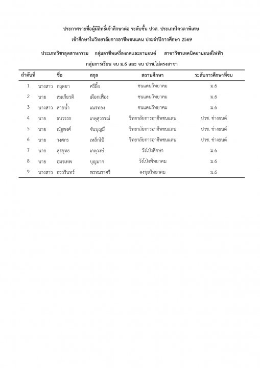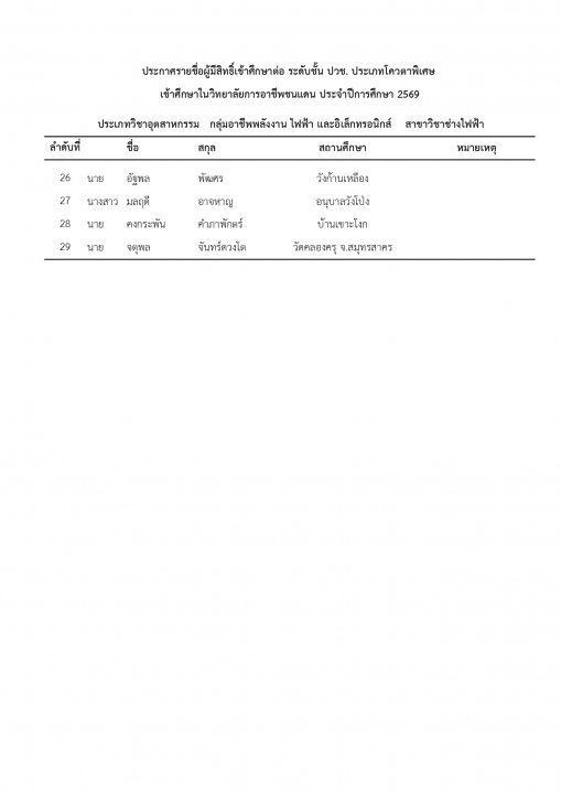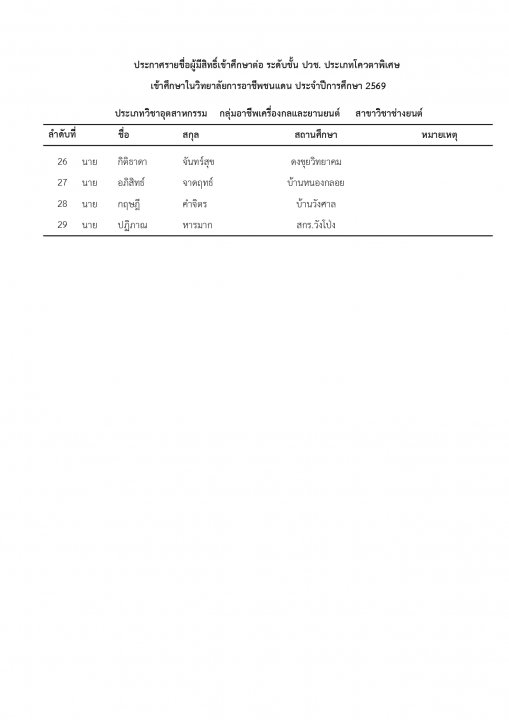 | หัวข้อข่าว | แจ้งรายชื่อนักเรียน นักศึกษา ที่ได้รับการคัดเลือกเข้าศึกษาต่อ ระดับ ปวช. และ ปวส. ประเภทโควตา ปีการศึกษา 2569 |