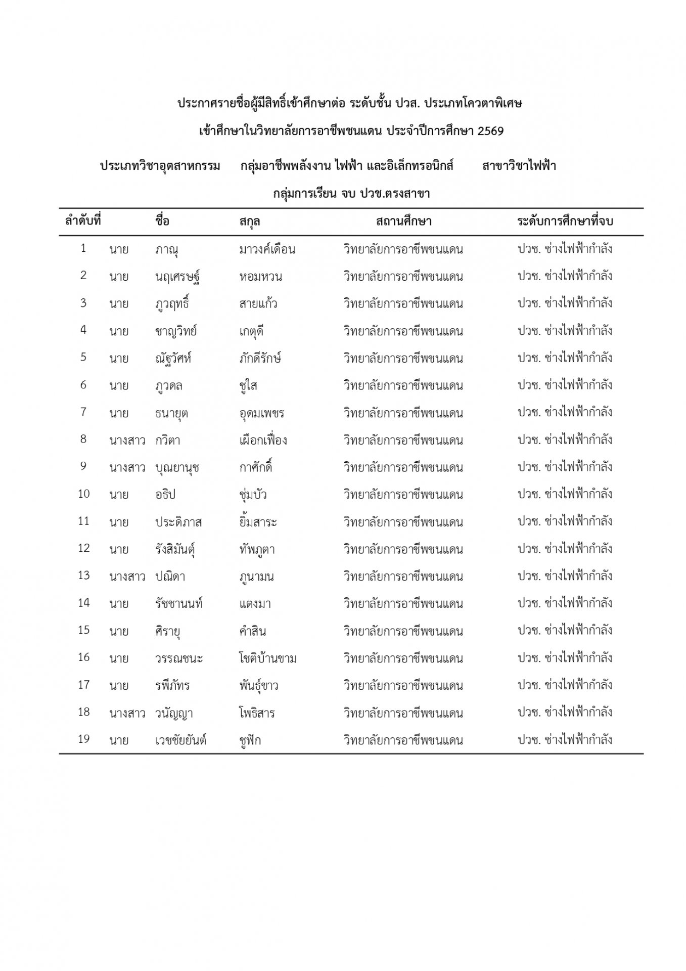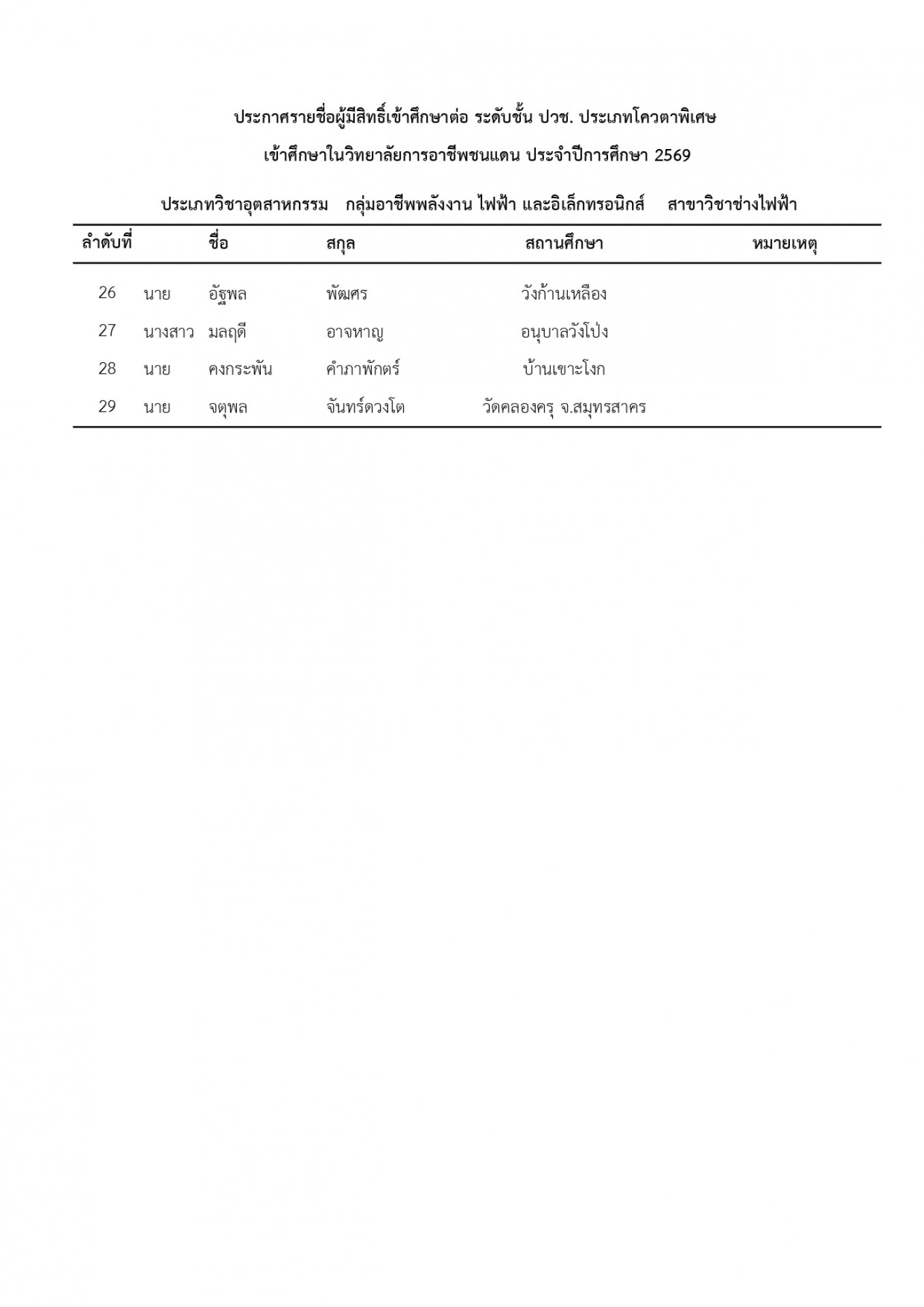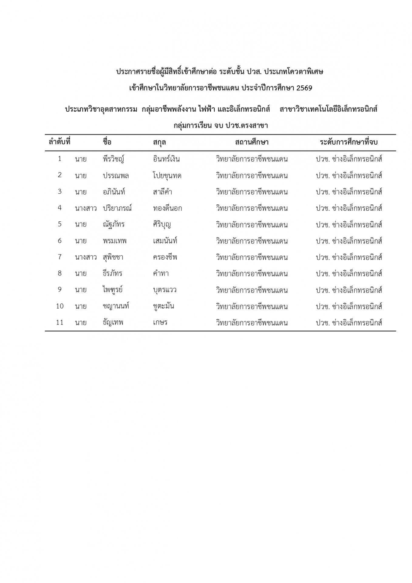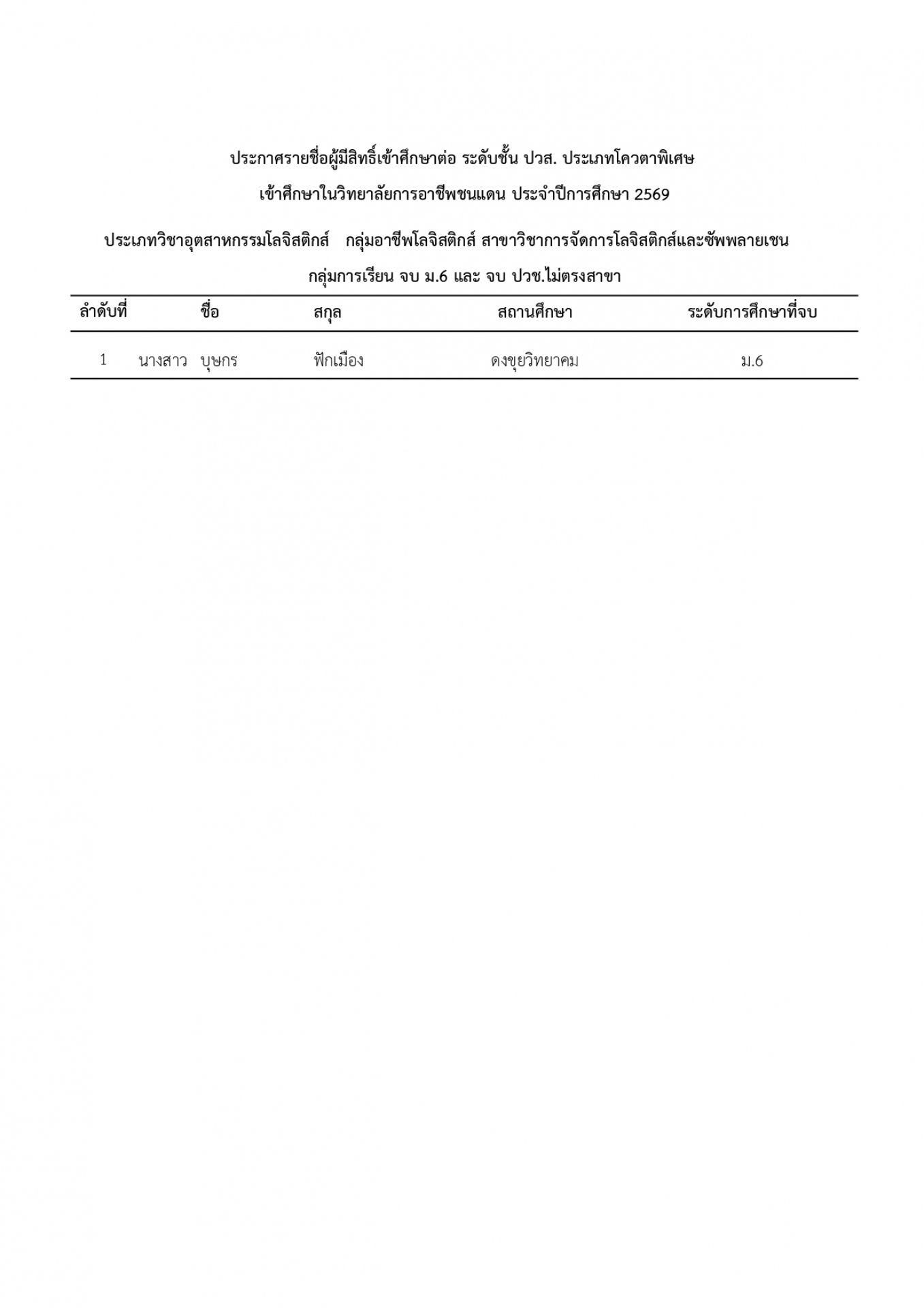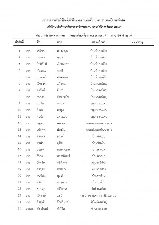 | หัวข้อข่าว | แจ้งรายชื่อนักเรียน นักศึกษา ที่ได้รับการคัดเลือกเข้าศึกษาต่อ ระดับ ปวช. และ ปวส. ประเภทโควตา ปีการศึกษา 2569 |