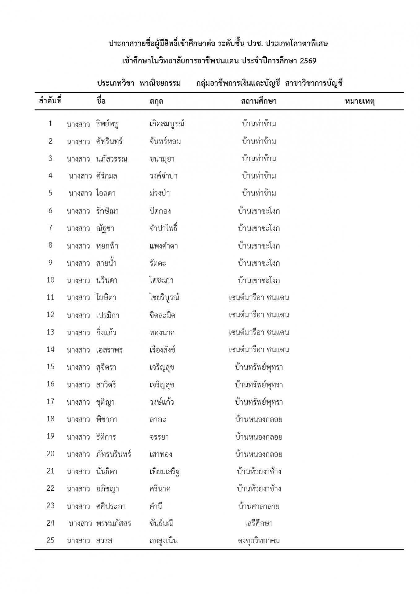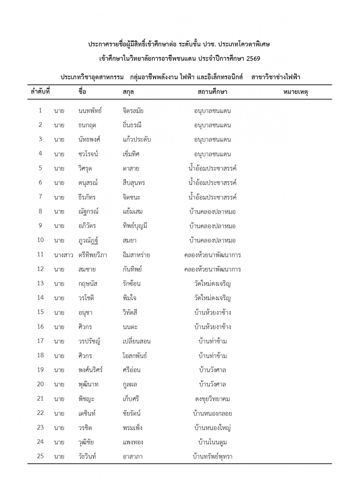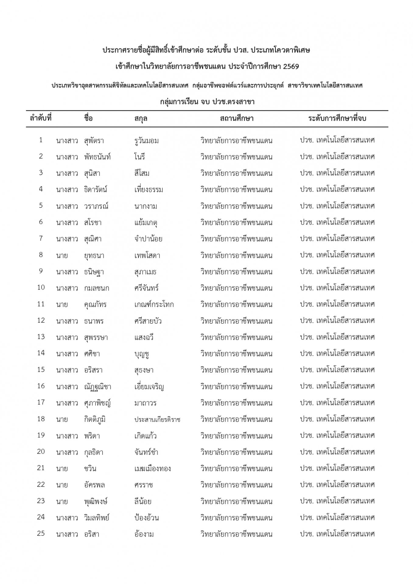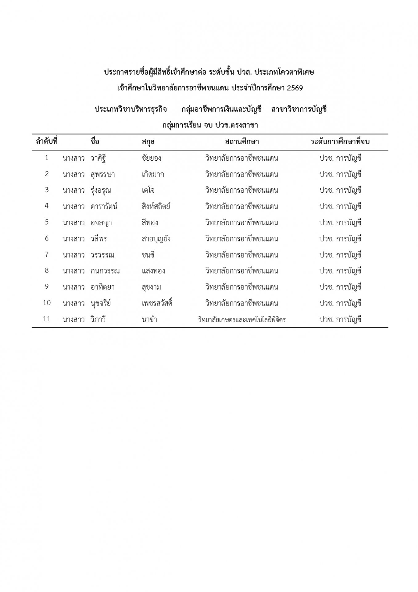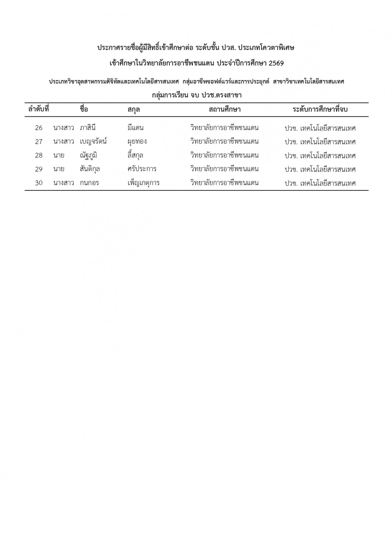 | หัวข้อข่าว | แจ้งรายชื่อนักเรียน นักศึกษา ที่ได้รับการคัดเลือกเข้าศึกษาต่อ ระดับ ปวช. และ ปวส. ประเภทโควตา ปีการศึกษา 2569 |