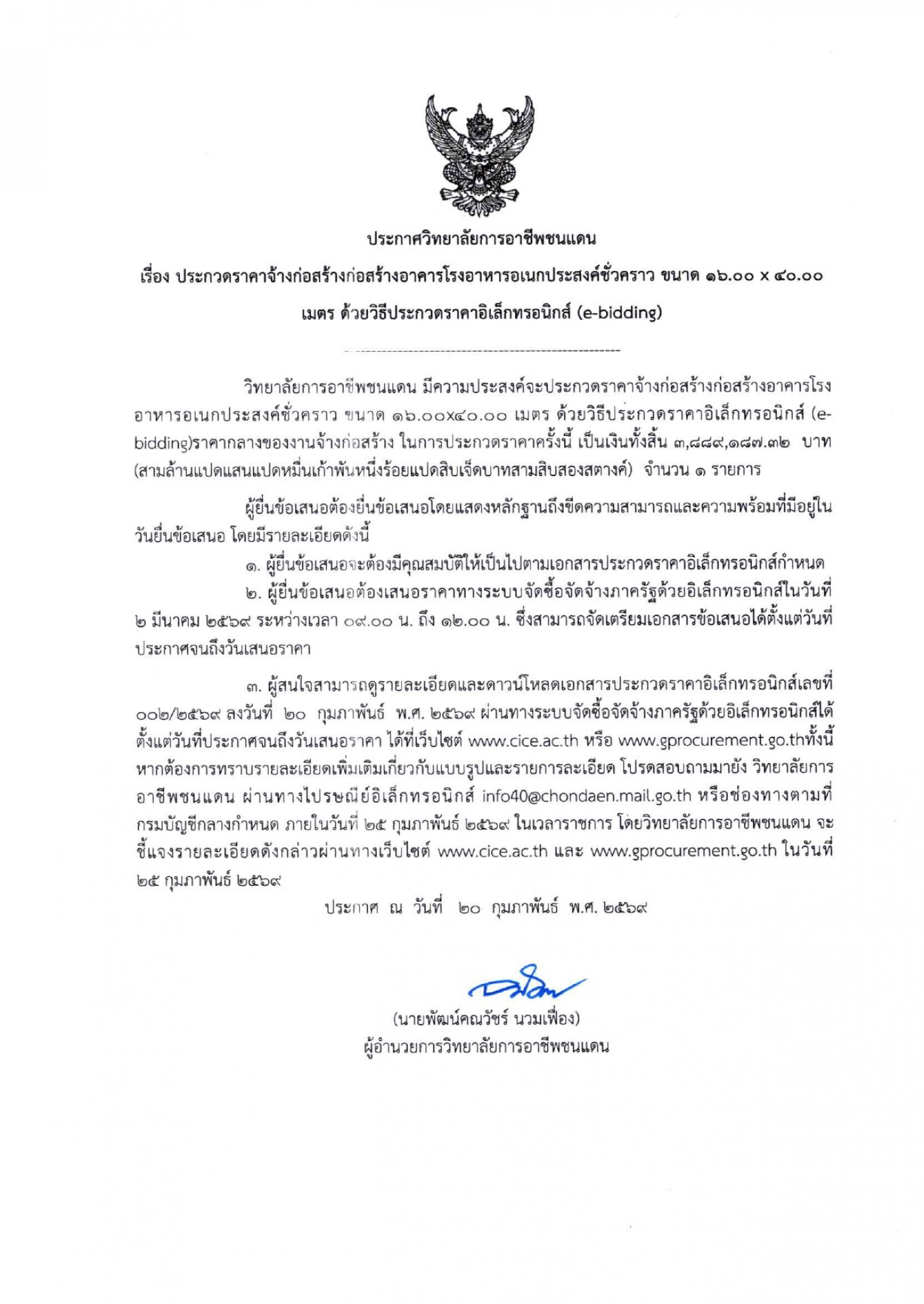 | หัวข้อข่าว | ประกาศวิทยาลัยการอาชีพชนแดน เรื่อง ประกวดราคาจ้างก่อสร้างอาคารโรงอาหารอเนกประสงค์ชั่วคราว ขนาด ๑๖.๐๐ x ๔๐.๐๐ เมตร ด้วยวิธีประกวดราคาอิเล็กทรอนิกส์ (e-didding) |