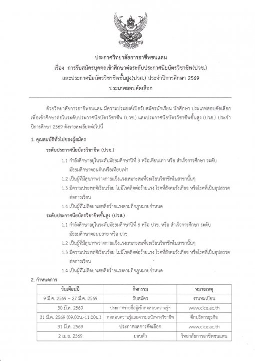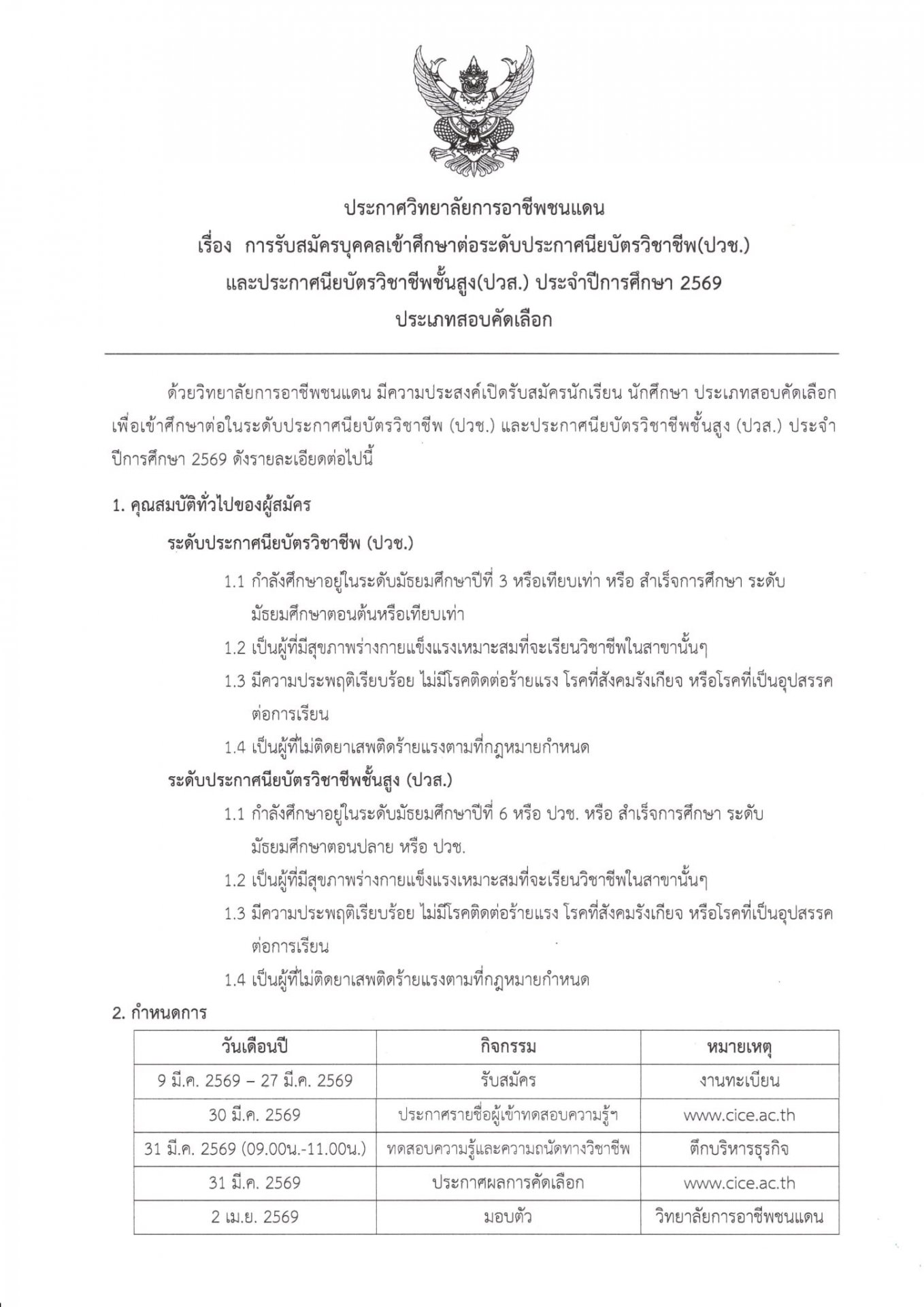 | รายละเอียดข่าว | เปิดรับสมัครนักเรียนนักศึกษาใหม่ [รอบสอบคัดเลือก] ระดับ ปวช. และ ปวส. ประจำปีการศึกษา 2569 สมัครได้ตั้งแต่วันนี้ - 27 มีนาคม 2569 จันทร์ - ศุกร์ ตั้งแต่เวลา 08.30 - 16.30 น. ณ วิทยาลัยการอาชีพชนแดน |