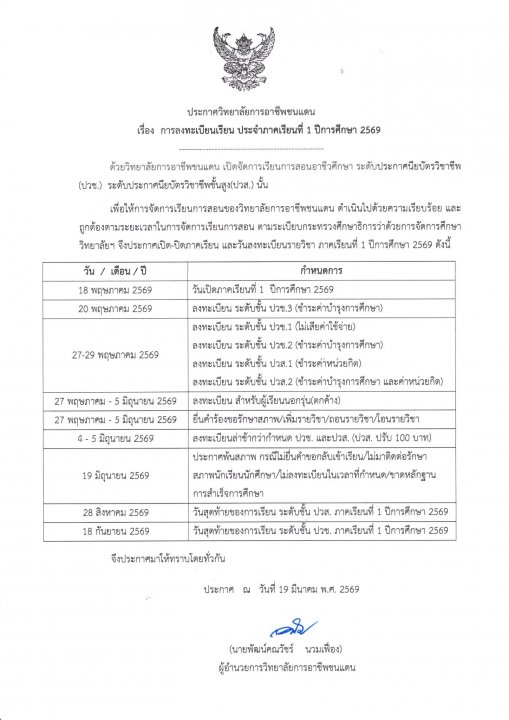 | รายละเอียดข่าว | ประกาศ วิทยาลัยการอาชีพชนแดน เรื่อง การลงทะเบียนเรียน ประจำภาคเรียนที่ 1 ปีการศึกษา 2569 |